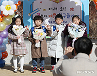 2日午前、ソウル市江東区のカンビッ小学校で、新入生の子どもたちが友だちと一緒に写真を撮っている様子。