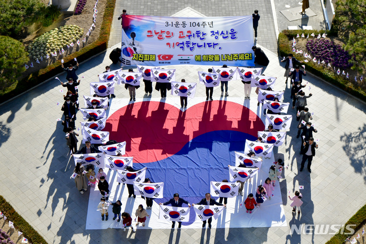 【NEWSIS】1919年3月1日の三一独立運動を記念する「三一節」104周年まであと二日となった27日午前、光州市北区庁の職員たちが太極旗(韓国国旗)を手に三一独立運動をたたえると共に、地震で大き..
