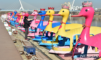 うららかな春の天気となった27日午前、大邱市東区にある東村遊園地のアヒルボート船着き場では、管理人が冬の間に溜まった汚れを落として客を迎える準備を進めていた。