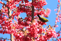 【NEWSIS】青空が広がった26日午前、済州特別自治道(済州島)西帰浦市の「李仲燮(イ・ジュンソプ)通り」で、紅桜のみつを吸うメジロ。