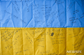 ロシアのウクライナ侵攻から1年となる24日午後、ソウル市竜山区の駐韓ウクライナ大使館に、応援メッセージの書かれたウクライナ国旗が掲げられている様子。