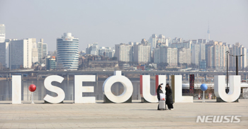 17日、ソウル市汝矣島の漢江公園にある「I・SEOUL・U」造形物の前を行き交う市民の様子。ソウル市は、新たなブランド開発に伴い、既存のブランド「I・SEOUL・U」の造形物を18日から撤去し始め、3..