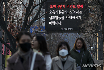 【NEWSIS】首都圏のPM2.5などの微小粒子状物質濃度が「不良」となった8日午前、ソウル・世宗大学に設置された電光板には「微小粒子状物質注意報発令」という案内文が表示されていた。