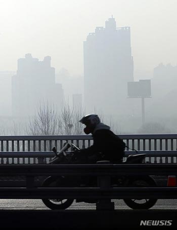 ソウルでPM2.5などの粒子状物質濃度が「不良」レベルとなった1日午前、元暁大橋から眺めたソウル中心部は白くかすんでいた。
