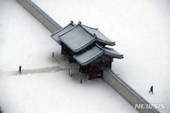 【NEWSIS】ソウルを含む首都圏に2-7センチメートルの積雪があるとの予報が出された26日午前、ソウル市鍾路区の景福宮近くで、雪の舞う中を歩く人々。