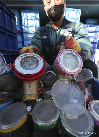ソウル市が今冬初めて、寒波による水道メーターの凍結破損に対する「深刻」を発令した24日午前、ソウル市鍾路区のポンプ場では、関係者が凍って破裂したメーターを整理していた。水道計量器凍結破損予報には「関..