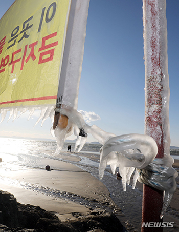 旧正月(今年は1月22日)の連休最終日で、厳しい寒波が到来した24日午後、釜山市沙下区の多大浦海水浴場では、岩場の施設物が凍り付いていた。