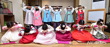 旧正月(ソル。今年は1月22日)の連休が迫る19日午前、大邱市北区のデウォン幼稚園で開かれた「ソル 名節体験行事」で、歳拜を習う園児たち。