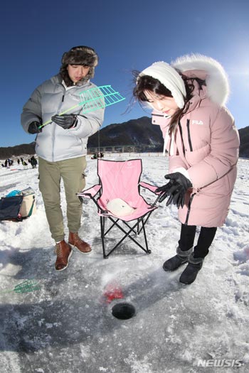 江原道麟蹄郡南面富坪里のワカサギ湖では20日午前、氷上釣りを体験するため訪れた観光客たちが、同日開幕した2023年第23回麟蹄ワカサギ祭りの会場で冷たい風が吹く厳しい寒さの中、釣りを楽しんでいた。ワ..