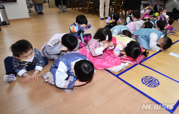 旧正月(今年は1月22日)連休を控えた17日、区立サムスンアート保育園の園児たちが、ソウル市松坡区のマンション・文井レミアン内の高齢者交流施設を訪れ、新年のあいさつをした(写真=共同取材財団)。