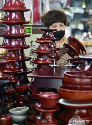 【NEWSIS】旧正月(今年は1月22日)が近づいた11日午後、大邱市中区の西門市場で、先祖にお供えするための器のセットを見る買い物客。
