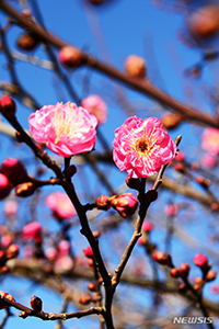 12日午前、慶尚南道南海郡南面では道路わきの紅梅が花開き、視線を引き付けていた。