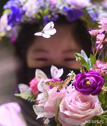 温かい天気となった12日、エバーランド(京畿道竜仁市)のLIVEチョウ体験館では、子どもたちが美しいチョウを見つめていた。