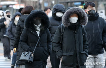 【NEWSIS】29日午前、ソウル・光化門交差点で、最低気温が氷点下8℃という厳しい寒さの中、厚手の防寒着を着て出勤する人々。