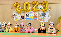 光州市の北区職場オリニチプ(民間保育施設)の園児たちが29日午前、「うさぎ年」に当たる癸卯(みずのとう)年を前に、ウサギを模した仮面を付けて授業を受けている様子。