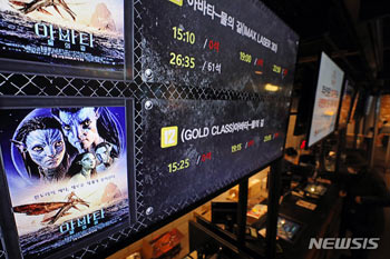 映画『アバター:ウェイ・オブ・ウォーター』は、公開2週目の終末に200万人近い観客を集め、累積観客数は550万人を突破した。写真は26日午後、ソウル市内の映画館の電光板に表示された同作の上映案内の様子..