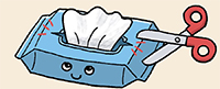 ウェットティッシュの袋の口の両端をはさみで少し切ると、ウェットティッシュを引き出す時に数枚が束にならず、1枚ずつ取り出しやすくなる。