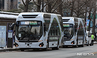 22日、ソウル市鍾路区の青瓦台近くで運行している電気自動車タイプの大型自動走行バスの様子。ソウル市はこの日から、青瓦台と景福宮付近で大型電気自動走行バスの定期運行を開始した。自動走行バスは、青瓦台と..