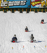 【NEWSIS】寒波が続く18日、京畿道果川市内のテーマパーク「ソウルランド」で雪ぞりを楽しむ人々。