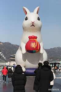 16日午前、ソウル市鍾路区の光化門広場に、うさぎ年の2023年に合わせて大型のウサギが設置されている様子。