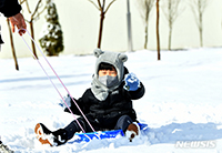大雪警報が発令された17日午後、光州市西区念珠洞のペッパー・スタジアム周辺では、子どもたちがソリに乗って遊んでいた。