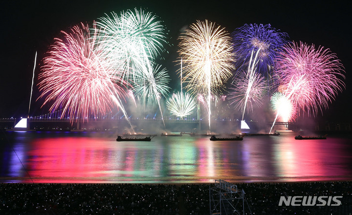 「第17回釜山花火祭り」が開かれた17日、釜山市水営区の広安里海水浴場一帯で華麗な花火ショーが繰り広げられている様子。今回の花火祭りは、新型コロナ問題の長期化で疲れている市民を慰労するため、3年ぶりに..