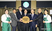 京東市場商人連合会のキム・ヨンベク会長(写真左から二人目)と、スターバックス・コリアのソン・ジョンヒョン代表理事、中小ベンチャー企業部(省に相当)のチョ・ジュヒョン次官、同伴成長委員会の呉盈教(オ・ヨ..