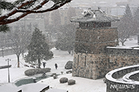 大雪注意報が発令された15日午後、京畿道水原市八達区の世界文化遺産、水原華城では雪が降っていた。