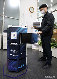 ソウル市中区のソウル市庁で22日、職員がソウル市の第1号ロボット公務員「ロボ官」(ロボット+主務官)に、届けてほしい文書を渡している。エレベーターに乗って各階を移動できる「ロボ官」は、文書配送と陳情者..