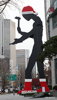 21日、ソウル市鍾路区のセファ美術館前にあるオブジェ「Hammering Man」はサンタクロースの帽子をかぶっていた。