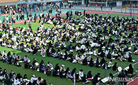 2023年度大学修学能力試験(修能。大学入学共通テストに相当)をあすに控えた16日午後、大邱市中区の慶北大学師範学部附属高校グランドで、受験票をもらうため並んで座っている受験生の様子。
