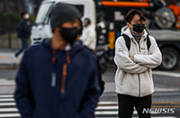 ソウル市鍾路区の世宗路交差点では16日、厚着をして行き交う市民たちの姿が見られた。