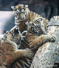 11日午後、京畿道果川市に位置するソウル大公園の猛獣舎で遊び回っている、雌のアムールトラ「ペンザ」と3頭の子どもたち(ヘラン、ペラン、サラン)の様子。