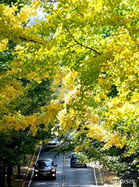 【NEWSIS】空気がひんやりした6日午前、済州大学の街路樹通りではイチョウの葉が黄色く染まり、深まりゆく秋を感じさせた。