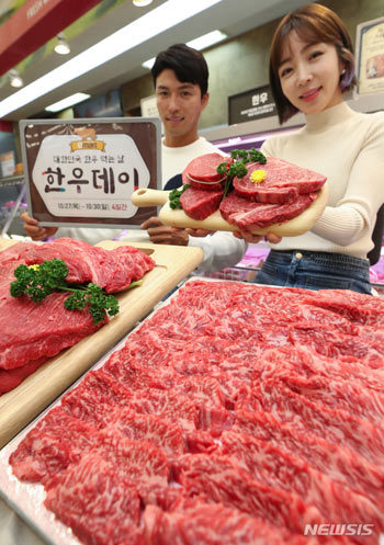 26日、ソウル市城東区の大手スーパー「Eマート聖水店」で、Eマート韓牛デーの割引イベントを紹介しているコンパニオンの様子。EマートとSSGドットコムは、新世界グループの割引イベントデーである「スク・デ..