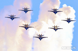 20日午前、慶尚南道泗川市の韓国空軍第3訓練飛行場で開かれた2022泗川エアショーにて、韓国空軍の特殊飛行チーム「ブラックイーグルス」が演技飛行を披露している様子。
