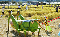 【NEWSIS】16日午後、慶尚北道星州郡のオウルリム庭園一帯で「2022伽耶山黄金のバッタ祭」が開催された。写真は田んぼでバッタをつかまえて楽しむ参加者たち。