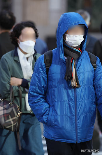 初冬を思わせる寒さとなった12日午前、ソウル市内の世宗路交差点では、厚着をして出勤する市民らの姿が見られた。