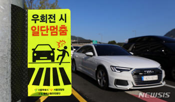 12日午前、ソウル市内の道路に「右折時は一時停止」の案内板が掲げられていた。歩行者保護義務を強化した道路交通法の施行から3カ月間の啓導期間が終了したことにともない、この日から横断歩道前の一時停止と関..