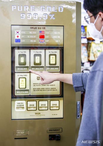 28日午後、ソウル市江南区のGS25駅三ホンイン店を訪れた市民が、「金の自販機」を利用しているところ。GSリテールは、コンビニチェーンGS25とスーパーマーケットGS THE FRESH合わせて5カ所..