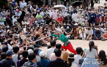 秋夕(中秋節)に当たる10日、ソウル市中区の南山コル韓屋村を訪れた市民が「朝鮮サーカス ソッテチェンイ牌(曲芸団):ペクヒ」公演を鑑賞している様子。