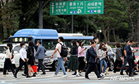 四日間の秋夕(中秋節。今年は9月10日)の連休が終わり、再び日常が始まった13日午前の出勤時間、ソウル市鍾路区世宗大路の交差点を渡る市民の様子。