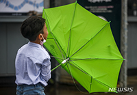 【NEWSIS】台風11号(アジア名:ヒンナムノー)が北上中の4日午後、ソウル市永登浦区の汝矣島漢江公園で。強風により傘があおられて裏返ってしまった。
