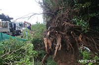 【NEWSIS】台風11号(アジア名:ヒンナムノー)が韓国を通過した6日午前、済州特別自治道済州市内では、道路横に立っていた木が強風で根元から倒れていた。