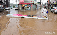 【NEWSIS】台風11号(アジア名:ヒンナムノー)が慶尚北道浦項市内を襲った6日午前、強風により落ちた看板の片付け作業が行われていた。