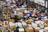 ソウル市広津区の東ソウル郵便物流センターで1日午前、秋夕(中秋節。今年は9月10日)の名節を前に、宅配物の分類を行っている職員の様子。今年の秋夕名節の小包郵便物は、およそ1917万個に達すると予想され..