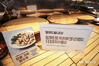 1日午前、ソウル市竜山区の大手スーパー「ロッテマート・ソウル駅店」のデリコーナーに、半額タンスユク「一粒いっぱいタンスユク」売り切れの案内文が掲示されている様子。外食物価が上昇傾向を示す中、大手スーパ..