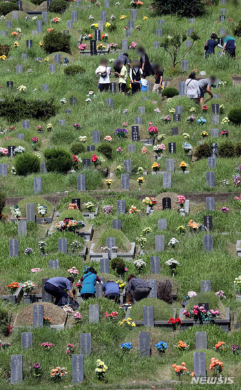 【NEWSIS】秋夕(チュソク=中秋節)連休(今年は9月9日-12日)まであと2週間となった28日、釜山市金井区の公園墓地・永楽公園を訪れ、草取りや墓参をする人々。