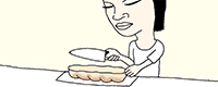 バゲットやメロンパンのようにパンくずが出やすいパンは、底の方を上にして切ると、表面がそれほど割れずにパンくずが少なくて済む。
