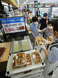 ソウル市城東区の大手スーパー「Eマート聖水店」で19日午前、1羽分5980ウォン(約615円)で販売されるフライドチキン(9号)を買うため列を作って待っている市民の様子。